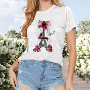 Women’s Paris Eiffel Tower & Floral Bow Print Tee – Fashion Round Neck Summer Top